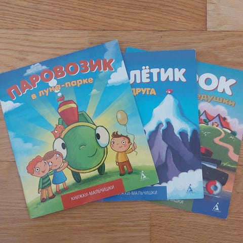 Venäjänkielinen kirjapaketti, joka sisältää sekä lasten että aikuisten kirjoja ja tehtäväkirjoja. Mukana on kuvakirjoja, tietokirjoja, tarinakirjoja sekä erilaisia tehtävä- ja puuhakirjoja, kuten numeroiden ja kirjainten harjoittelua, tarroja ja muita oppimistehtäviä.