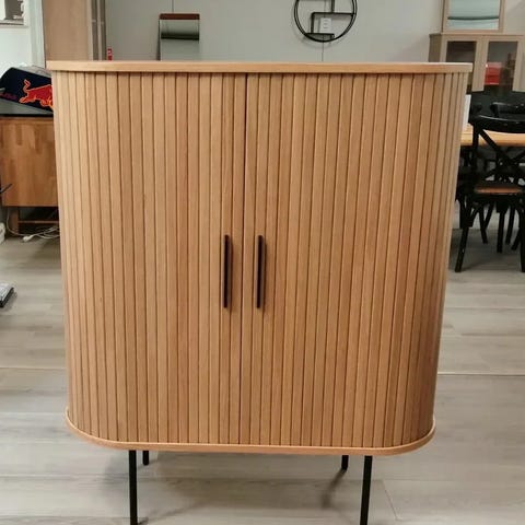Upea ovaalinmuotoinen Nola-senkki tarjoaa tyylikkään ja toiminnallisen ratkaisun sisustukseen. Tammipaneelin, mustan metallin ja pyöristettyjen kulmien yhdistelmä luo tasapainoisen ja mielenkiintoisen ilmeen. Lisäksi tilaa säästävät liukuovet tarjoavat käytännöllisyyttä ja joustavuutta säilytysratkaisun käyttöön.