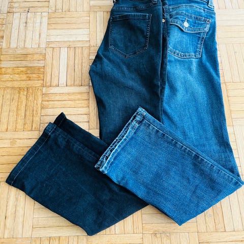 Farkkujen lahkeen sisäpituus on 47 cm, lantio 41 cm ja vyötaro 35 cm.