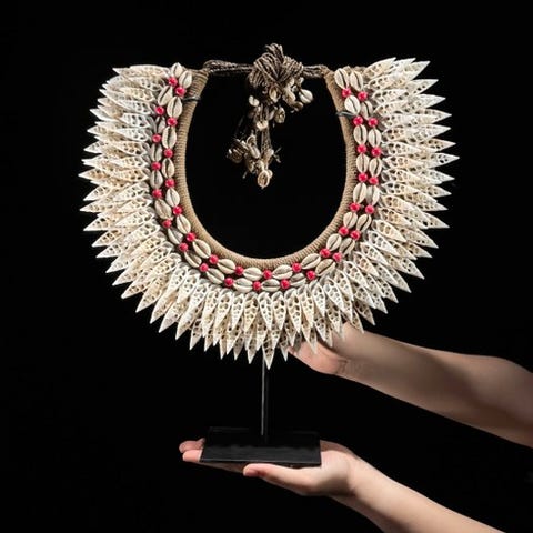Papua Uusi-Guineasta peräisin oleva simpukasta koostuva kaulakoru räätälöidyllä jalustalla.Kaulakoru koostuu kauniista luonnonvärisistä simpukoista, käsin punottu jute-taustapohjalle.Näkymän mitat mukaan lukien jalustaKorkeus: 40 cmLeveys: 35 cmHUOMAUTUS:- Yksi tai useampi kuva tarjoaa tyylitellyn esityksen vastaavasta esineestä. Tarkat tiedot myynnissä olevasta esineestä löytyvät muista kuvista. Tyylitellyssä kuvassa ei ole myynnissä esineitä mukana.- MAINITTU PAINO SISÄLTÄÄ PAKKAUSTA.LÄHETYS- Esine lähetetään Track & Trace -koodilla DHL Parcelin, DPD:n tai postNl:n kautta. Seuranta päivitetään Catawiki-kohteeseesi pian kun paketti on jätetty kuljetukseen.- Tarkista säännöllisesti ettei pakettia palauteta meille, tällöin ostaja vastaa toisen lähetyksen toimituskustannuksista.- Espanjan ja Portugalin seurannan vuoksi käytä tätä linkkiä ja lisää Catawiki-kohteen seurantanumerohttps://clientesparcel.dhl.es/LiveTracking/HomeEMME YHDISTÄ TOIMITUKSIA!!!Jos sinulla on kysyttävää paketistasi, ole hyvä ja ota yhteyttä Catawiki-viestipalvelun kautta. Pyrimme vastaamaan 3 työpäivän kuluessa.