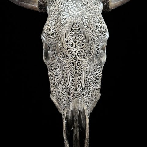 Ei vähimmäishintaa - Upean suuri harmaa kaiverrettu härän pääkallo -