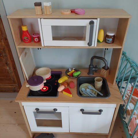 IKEA leikkikeittiö ja runsaasti oheistarvikkeita keittiö-/koti-/kauppaleikkeihin. Keittiö ollut ahkerassa käytössä ja jälkiä toki löytyy, mutta yleisilmeeltään siisti. Toisen oven alakulmaan tuli sisäpuolelle murtuma, kun lapsi istui oven päällä sen ollessa auki. Murtunut kohta liimattu ja korjaus kestänyt jo useamman vuoden, ei vaikuta käyttöön tai näy ulospäin. Vain nouto.
