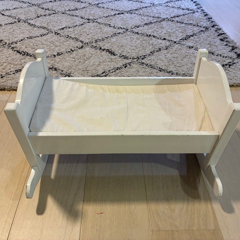 Nuken sänky, materiaali valkoista puuta tai mdf-levyä. Todella siisti ja hyväkuntoinen. Pohja säädettävissä kahteen korkeuteen. Baby Born mahtuu tähän hyvin. Sopii sisäkäyttöön.