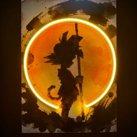 Aihe ja teema:Tämä digitaalinen teos kunnioittaa Dragon Ballin universumia, ikuistaa joukon ikonisia hahmoja, joita johtaa Goku poika. Räjähtävä koostumus on rikastettu Shenronin, Krillin, Mestari Muten, Vegeta, Trunks ja Majin Buu -hahmojen läsnäololla, värien ja liikkeen pyörteessä, joka muistuttaa mangan energistä tyyliä. Kuvan keskellä Goku puristaa käsissään Dragon Ball -kolmesti tähdellä varustetun Dragon Ball - KIVEN, korostaen LED-valoren renkaalla, joka muuntaa yksityiskohdan voimakkaaksi energian ja magian symboliksi.Tekniikka ja luominen:Teos on toteutettu korkearesoluutioisella digitaalisella käsittelyllä ja tulostettu premium PVC:lle, kiiltävän naarmuuntumisen kestävän pinnan avulla, jolloin värit ovat kirkkaita ja pitkäikäisiä. Integroitu LED-rengas antaa teokselle ainutlaatuisuutta, luoden vaikuttavan kontrastin ja korostaen kohtauksen. Jokainen kappale on käsityöläistuote, maallinen allekirjoitus takareunassa ja mukana aitoustodistus.Inspiraatio ja kiehtovia seikkoja:Kohtaus ilmentää ryhmän tunnetta, seikkailua ja ystävyyden voimaa, Dragon Ball -pallon muuttuessa visuaaliseksi ja symboliseksi keskipisteeksi. Kirkas LED korostaa sarjan maagista elementtiä, tehden teoksesta täydellisen keräilijöille ja fanille, jotka etsivät yhdistelmää taiteesta ja pop-kulttuurista.Olemme varanneet 40 kappaletta tästä kokoelmasta yksinomaan Catawikiä varten. Yhteensä teos kuuluu RAJOITETTUUN ERIKKALAATUUN vain 100 kappaleen sarjaan. Jokainen kappale tulee aitoustodistuksen (COA) kanssa, on käsin signeerattu ja numeroitu teoksen takana, mikä takaa sen ainutlaatuisuuden ja arvon.12V korkealaatuinen neon-efekti ja pitkäikäinen.Läpinäkyvä, naarmuuntumattomasti suojaava resiinipäällyste etupuolella.Forex-tuki 1 cm.Sisältö: noin 2 metrin läpinäkyvä johto ja 12V DC 5,5x2,1 virtalähde EU-pistokkeellaTÄMÄ TEOS ON TEHTI KÄSITYÖMENETELMILLÄ, EI TEOLLISUUDEN.JA MAHDOLLISET PIENET EPÄTASAUDET EIVÄT OLE VIKOJA, VAAN OSA, JOLLA ON OMINAISPIIRTEITÄ, JOTKA TODISTAVAT ERIKOISTA KÄSITYÖMANUALIKoska teokset ovat melko hauraita, käytetään seurantaa ja vakuutettua toimitusta sekä kuljetus- ja suojapakkausta.