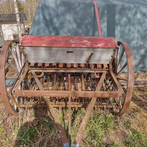 Vanhat kylvökoneen pyörät pihan koristeeksi vaikka portin pieleen.