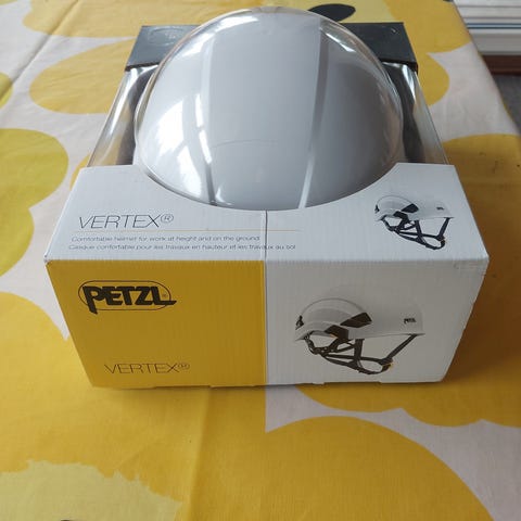Uudenveroinen valkoinen Petzl työkypärä leukahihnalla.
