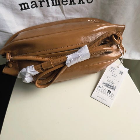 Marimekko Pikku Karla tummanruskea nahkalaukku. Laukku on uusi ja käyttämätön, hintalappu on edelleen kiinni laukussa. Mukaan tulee dustbag.