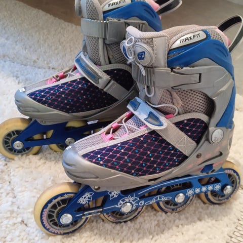 Kuvan vehkeet, luistimissa koko 31-33 ja suojat tarkoitettu 100-130 senttisille.