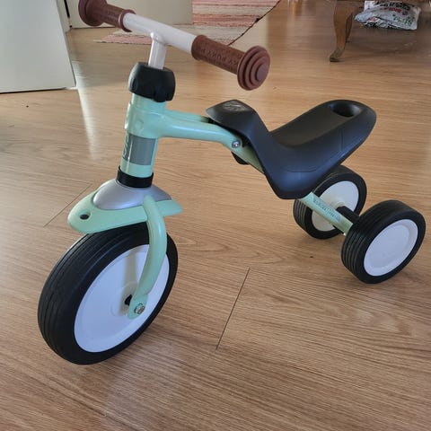 Vihreä soittokellollinen ja lokasuojallinen Pukyn potkupyörä.