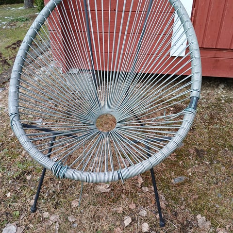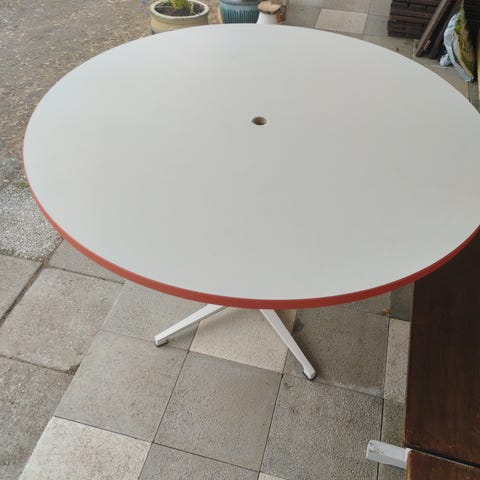 Metallirunkoinen lasilevyinen pöytä terassille. Kunto hyvä, mutta satunnaista ruostejälkeä on näkyvillä. Temperoitu lasi.