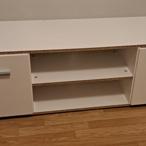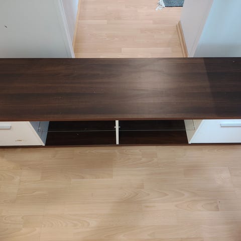 Annetaan noin 85cm leveä tv-taso. Laatikot sisältä valkoiset ja jonkin verran kulumajälkeä näkyvissä. Koitettu saada mahdollisimman hyvin kuvissa näkymään :)