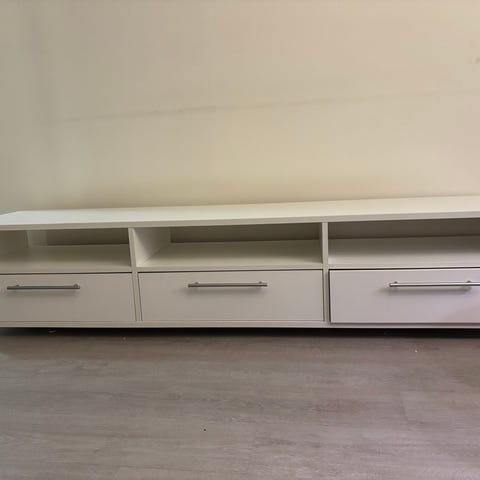 Valkoinen TV-taso laatikoilla. Kuin uusi ja hyvässä toimintakunnossa. Mitat: Pituus 175 cm, Leveys 40 cm.