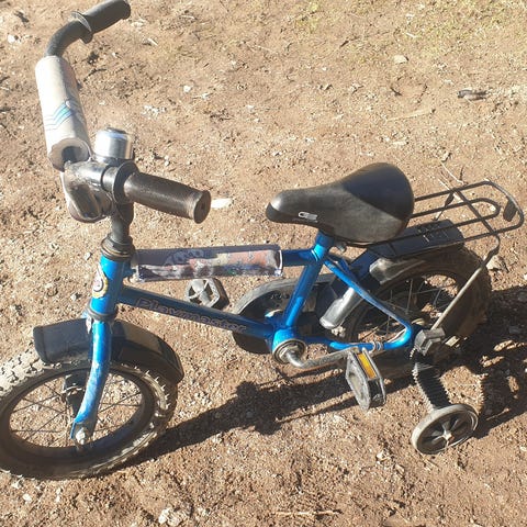 Potkupyörä (12,5"), jossa jo käytönjälkeä, kuitenkin hyvin ajanut asiansa. Pyörässä jarru, joka ei toimi, mutta ei ole käyttöä haitannut, ei ole koitettu korjata, kun lapsi ei ole jarrua kaivannut. Nouto Renkomäki. 12e.