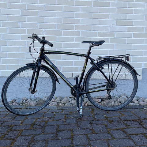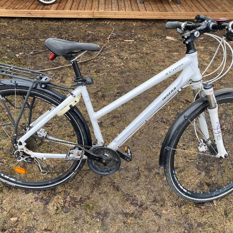 Whiten naisten hybridipyörä. Kahtena kesänä ajettu, alkuperäiset renkaat paikoillaan. Siistikuntoinen. Lisävarusteena lokasuojat, seisontatuki, tarakka ja siinä kori.