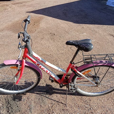 Vaaleanpuna-valkoinen polkupyörä. En muista kokoa 😊