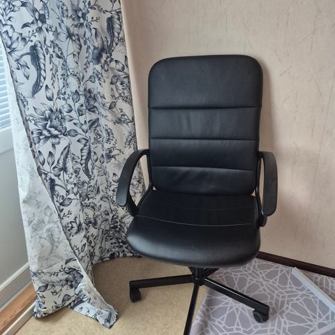Musta työtuoli, jonkin verran kulumaa istuinosassa. Korkeus säädettävissä, pyörii, ei narise. Vain haku haapaniemeltä.