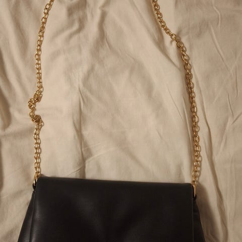 Laukussa on kullanväriset metalliosat, vetoketjusuljenta sekä kaksi erilaista hihnaa (irrotettava ja säädettävä olkahihna).