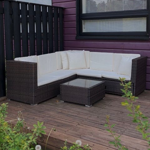Kulmamallinen polyrottinkinen terassisohva vaaleilla pehmusteilla