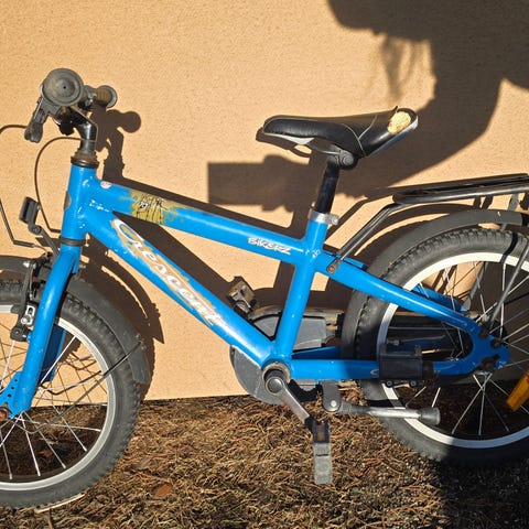 Lasten polkupyörä 16" renkailla.. Edessä on irrotettava kori ja takana tavarateline. Pyörässä on käsijarru ja polkimet heijastimilla. Mukana tulee erilliset apupyörät, jotka voidaan kiinnittää tarpeen mukaan. Sopii lapselle, joka käyttää 16" kokoista lastenpyörää.