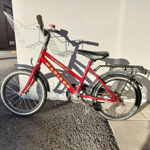 Toimiva lastenpyörä. Satulan kangas haljennut, ruostetta siellä täällä. Ei priimakuntoinen, mutta toimii hyvin ja on ehjä.
