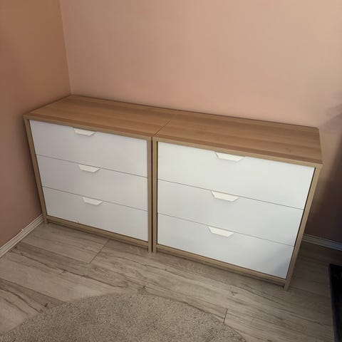Hyvässä kunnossa olevat kaapit. Toinen on kaksi ovinen ja vasemmalla puolella on yksi ovinen