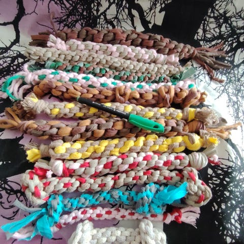 Koiran lelu, jossa tennispallo ja punottu köysi. Pallot ja köydet ovat monivärisiä. Sopii koiran leikkiin, noutoleikkeihin ja vetoleikkeihin. Materiaalina tennispallon pintamateriaali ja punottu tekstiiliköysi.