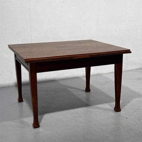 Rustiikkinen vanha ruokapöytä, jossa on tukeva jalka ja keskeltä laajennettava kansi +40cm. Pöydän mitat ovat 120cm x 80 cm, ja se on valmistettu tummasta puusta. Pöydän pinnassa on havaittavissa kulumaa ja naarmuja.
