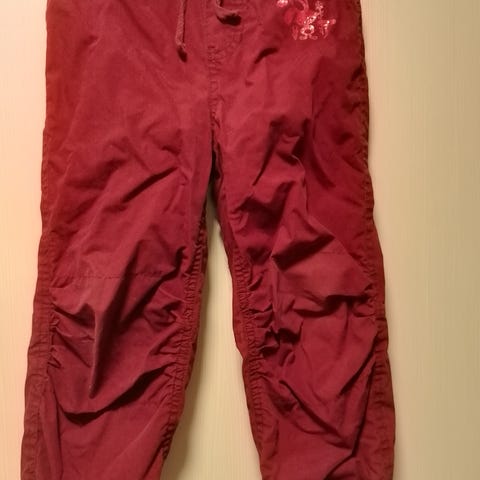 Myydään hyväkuntoiset ruskest ulkohousut, joissa toisessa lahkeessa kukkakuviointi. Koko 98.