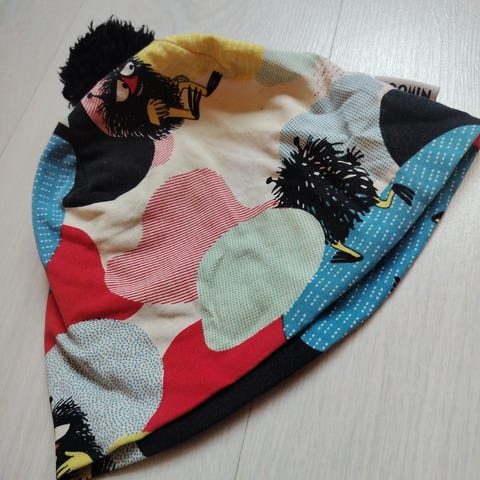 Värikäs lasten pipo unisex-mallina. Pipossa on kirjava kuosi ja Moomin-merkki, päällä keltainen tupsu. Materiaalina puuvilla, sisäpuolella pehmeä fleecevuori. Koko sopii vauvalle tai pienelle lapselle (noin koko 46/48).