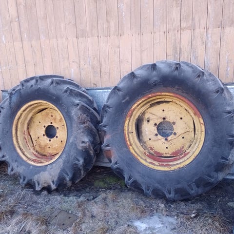 -80 luvun kumit päällä millä ei mitään virkaa. Kumi on 16,9R38 mutta vanteeseen käynee 460/85R38 tän päivän 18,4" kumi mainiosti.
