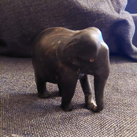 Elefantti koristefiguuri musta. Pieni seisova norsuhahmo, jossa kärsä on kohotettuna ylöspäin. Materiaali vaikuttaa olevan kovaa, kiiltäväpintaista massaa tai kiveä, ja syöksyhampaat ovat vaaleat. Sopii sisustusesineeksi hyllylle, pöydälle tai kokoelmaan. Kuvissa näkyvä pienempi norsu kaupan päälle