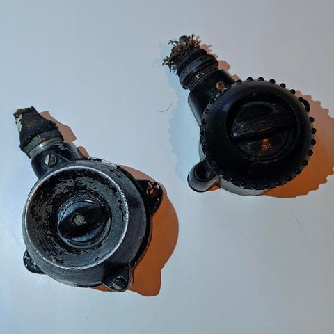 Tämä upea koristeellinen bakeliittilaatikko, valmistettu aikana, jolloin bakeliitti oli olennaisen ylellinen materiaali, ilmentää vintage-hienostuneisuuden ja kestävän käsityön täydellistä yhdistelmää. Bakeliitti, ensimmäinen täysin synteettinen muovi, kehitettiin 1900-luvun alussa ja siitä tuli Art Deco- ja Modernismin suunnittelun synonyymi 1920–1930-luvuilla, koristellen koruja, puuterilaatikoita, pöytätarvikkeita ja arjen aarteita lämpimällä, kiiltävän hehkuavalla olemuksellaan. Koristeellisesti metallisellä reunuksella varustettu tämä kappale on enemmän kuin säilytysastian; se on hienostunut lisävaruste henkilökohtaiseen kokoelmaasi. Sen tyylikäs siluetti ja taktiilinen syvyys tekevät siitä haluttujen esineiden kohokohtaa mille tahansa lipastolle, peilikaapille tai boudoir-asetelmalle. Pohja on hieman vääntynyt, joten se seisoo hieman epätasaisesti. Se sulkeutuu kuitenkin edelleen, mutta avautuu helposti. Lukko ei ole mukana. Täydellinen: Hienon mekaanisesti säilyttää korut: sormukset, kaulakorut, rannerengasrungot ja perintöesineet; Suojata ylellisiä hajuvesipulloja tai tuoksuaarteita; Näyttämällä arvokkaat pienet koriste-esineet; Korostaa tyylikästä viritettyä vitriinialuetta vintage-glamourilla. Aarre keräilijöille, estetiikasta nauttiville ja kaikille, jotka arvostavat esineitä, jotka nostavat arjen rituaalit kauneuden hetkiksi. Korkeus (ilman kahvoja) - 15,5 cm Kahvojen korkeus — 12 cm Leveys - 11 cm Pituus - 20 cm