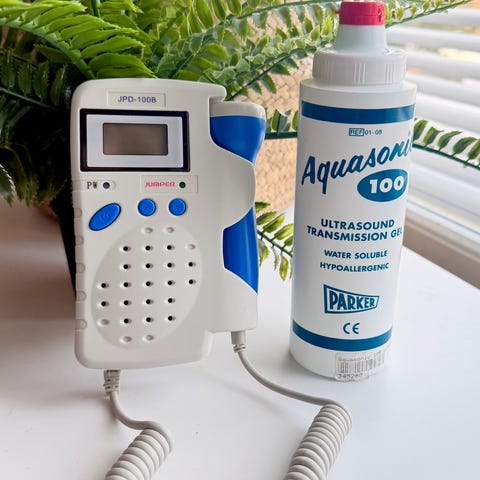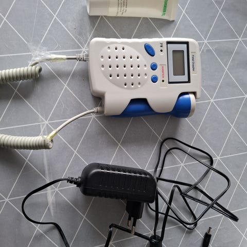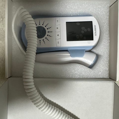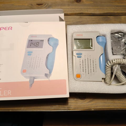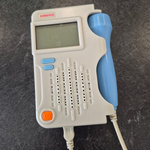 Jumper SHA20 doppler-laite. Kannettava doppler-laite sikiön sydänäänten kuunteluun. Mukana kuvassa näkyy Cetro Medical Cetro Ultragel Clear 250 ml -geeli (pullo puolillaan) jota voidaan käyttää laitteen kanssa. Soveltuu sydänäänten kuunteluun raskauden seurannassa ohjeiden mukaisesti.
