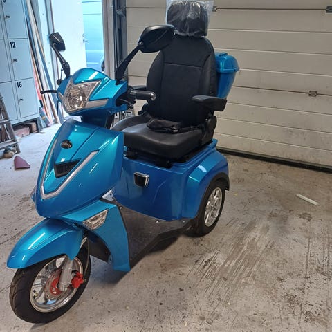 Scogo sähköskootteri valkoinen. Sähköskootterissa on leveät renkaat, etuvalo, takavalo, vilkut ja peili. Ajolauta on matala ja leveä, ja skootterissa on pitkä istuin sekä erillinen selkänoja tai toinen istuinosa takana. Soveltuu kaupunki- ja taajama-ajoon lyhyille matkoille. Rungon väri on valkoinen ja yksityiskohdat mustia. Sähkömoottori ja akku sijaitsevat keskiosassa rungon ala- ja keskiosassa. Skootterissa on jalkatuki pysäköintiä varten sekä rekisterikilven paikka takalokasuojassa.