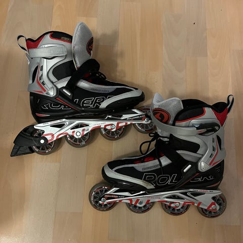 Viking merkkiset Pro tason rullaluistimet. 3x125mm renkaat joiden alla asfaltin pienet raot ei paljon tunnu. Kenkä lämmitettävä.