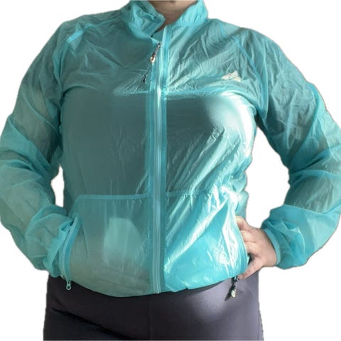 Takki on sininen, edessä vetoketju ja kevyt rakenne juoksuun ja muuhun ulkoliikuntaan. Selkäpuolella on heijastava raita paremman näkyvyyden tueksi. Materiaali on ohutta ja hengittävää. Käyttökertoja ollut yksi tai kaksi ollut.