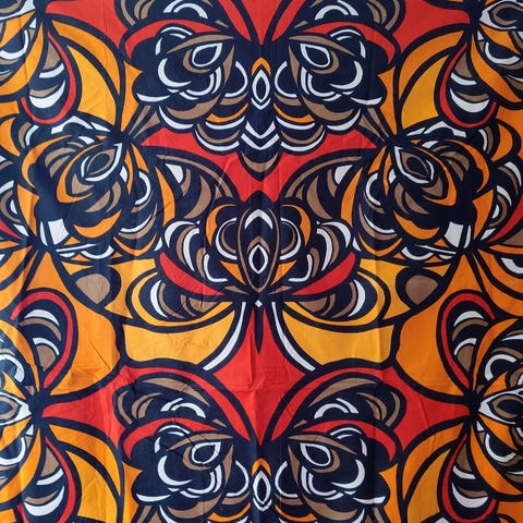 Värikäs retro pöytäliina 1970-1980-luvulta. Oranssia kahta sävyä ja valkoisia kuvioita.
