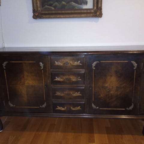 Tarkkaa vuosisataa ei tiedossa, rakenne tukeva kokopuinen, odottaa uutta kotia. Kunto on originaali, vaatii pientä laittoa, hienosäätöä. Korkeus 99 cm, syvyys 54 cm, leveys 113 . Voidaan tuoda uuteen kotiin erikseen sovittaessa.