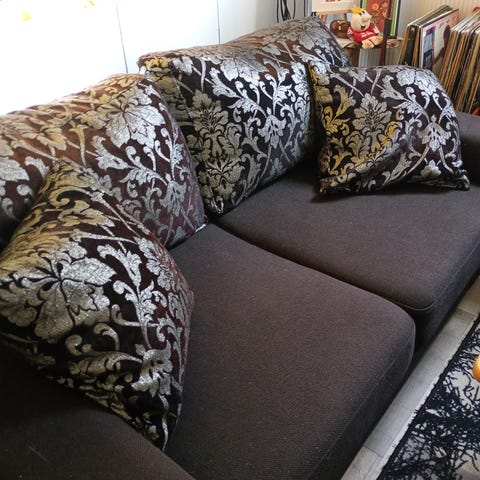 Hyväkuntoinen vuodesohva + Koristetyynyt + sävyyn matto yht. 45-