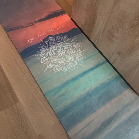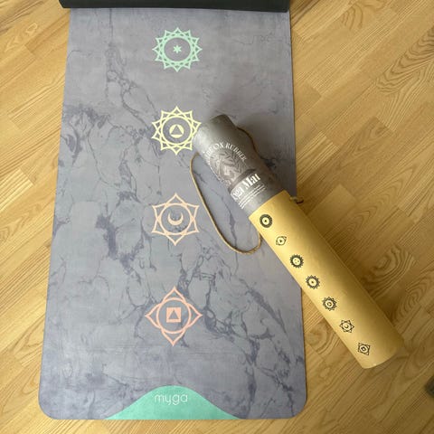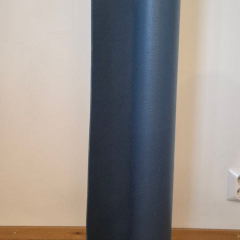 Musta joogamatto. Soveltuu jooga- ja muuhun lattiatason harjoitteluun. Matto on rullattava ja sidottu nauhalla säilytyksen ja kuljetuksen helpottamiseksi.