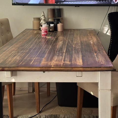 Myydään jykevä ruokapöytä, jossa rustiikkinen puinen kansi ja musta metallijalka. Pöydän ilme on lämmin ja rouhea – puun luonnolliset syyt tuovat siihen persoonallisuutta. Tukeva ja tilava pöytä sopii erinomaisesti ruokailuun isompaankin tilaan. Pöydän ääreen mahtuu helposti kuusi tuolia.