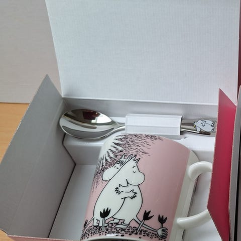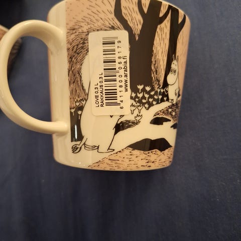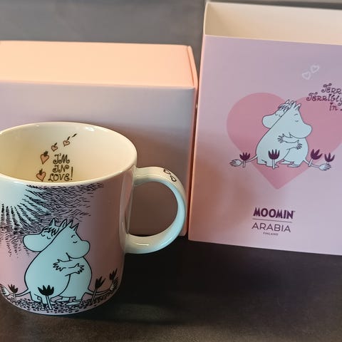 Myydään Rakkaus 30 juhlavuosi-muumimuki. Muki on käyttämätön ja paketissaan. Avattu vain kuvausta varten.
