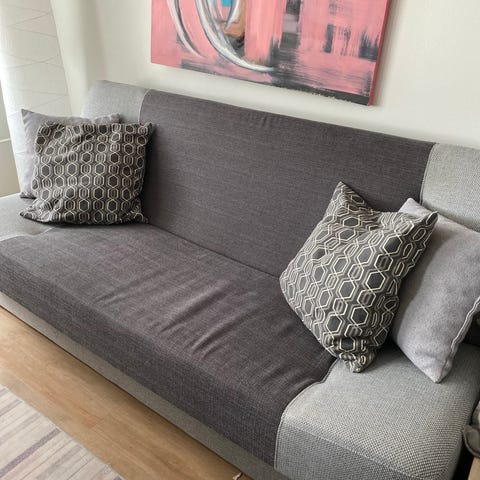 Annetaan levitettävä sohvasänky. Patjat todella hyväkuntoiset. Sohva nyt osiin purettuna, kuten kuvista näkyy. Helppo siis kuljettaa.