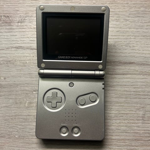 Game Boy Advance SP (Malli: AGS-001): Klassinen hopeanvärinen simpukkamalli. Konsolissa on käytön jälkiä ja naarmuja (katso kuvat), mutta näyttö on ehjä ja painikkeet vastaavat napakasti.