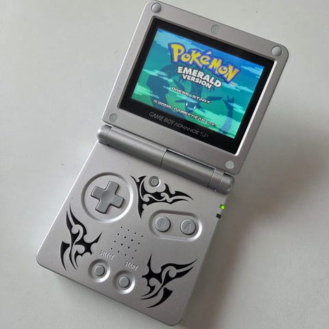 Game Boy Advance SP (Hopea) + Pokémon Fire Red + Huippulisävarusteet