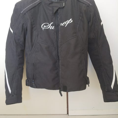 Sweep ajotakki koko 40. Väriltään pinkki-valkoinen, etu- ja takapuolella kirjailuja sekä heijastavia yksityiskohtia. Takissa on vetoketjulliset taskut edessä ja säädettävät kiristysremmit selkäpuolella. Sisäpuolella on CE-merkintä, joka kertoo, että takki on varustettu suojavarusteille tarkoitetuilla taskuilla tai suojilla. Malli on suunniteltu naisille moottoripyörä- tai skootteriajoon. Nouto.