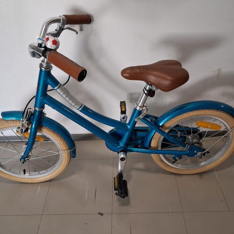 Lasten polkupyörä 16" renkailla. Rungon väri turkoosi, satula ja lokasuojat mustat, ohjaustangon kahvat keltaiset. Pyörässä on jalkajarru ja etujarru, heijastimet sekä seisontatuki. Sopii arviolta noin 4–6-vuotiaalle lapselle, riippuen pituudesta ja ajo taidoista.