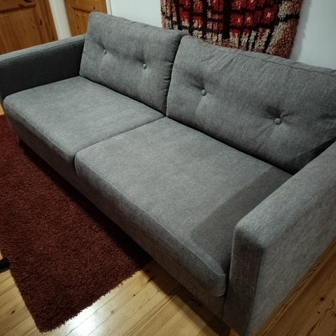 Sohvan mitat: pituus 220cm, syvyys 85cm, istuin syvyys 55cm, levitettynä 1m, alla tilaa vuodevaatteille, painava. Käsinojissa jonkin verran kissan raavinta jälkiä. Nouto, maksu käteisellä.
