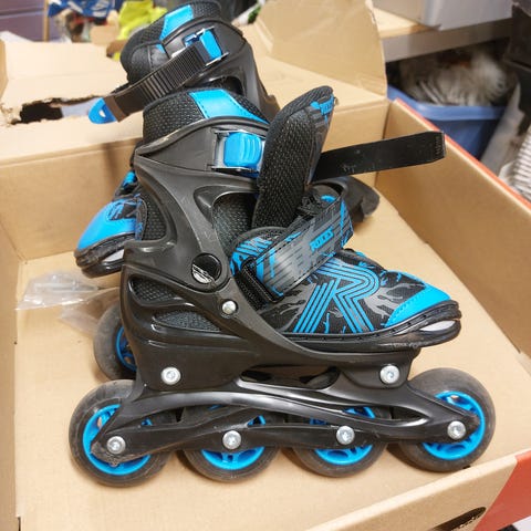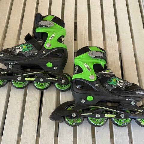 Turbine rullaluistimet lapselle, säädettävä koko 32–36 (valmistajan merkintä), sopivat noin kokoon 34. Väri musta-harmaa, limevihreillä yksityiskohdilla. Neljän renkaan malli, kova kuori ja pehmustettu sisäkenkä. Kiristys soljella, tarralla ja nauhoilla. Soveltuu rullaluisteluun ja peruskäyttöön lapsille.