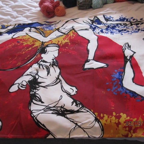 Vallila "Ruska" kankaasta ommeltu kappa.Kapan pituus 140 cm, leveys 59cm.